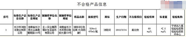 (二)王一实业集团精彩生活超市有限公司销售的标称长沙市浏阳河酒业有限公司生产的浏阳河红色经典(七年陈酿),氰化物检出值为69mg/L。比标准规定(不超过2mg/L)高出33.5倍。检验机构为宁波出入境检验检疫局检验检疫技术中心。