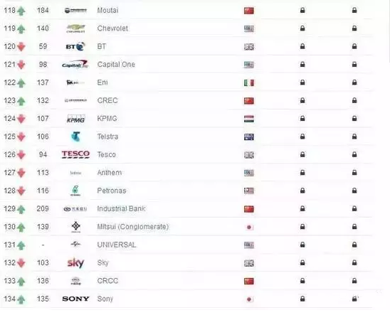 在中国品牌中,中国工商银行排名第十,是唯一进入前十的中国企业,中国移动紧随其后排名第十二,而BAT分别位于116(百度)、23(阿里)、47(腾讯),其中百度下滑了50位,跌出前100名。