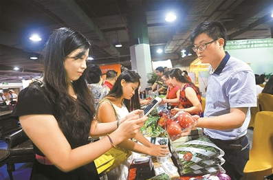 深圳相关企业自主研发的“食品安全溯源技术解决方案”,运用“互联网+大数据”,从食品源头监控等各环节进行监督。图为消费者通过手机扫描食品二维码,了解食品的信息。